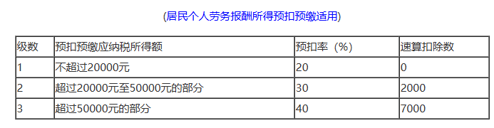 ②每次4000元以上:收入*(1-20%)*预扣率-速算扣除数
